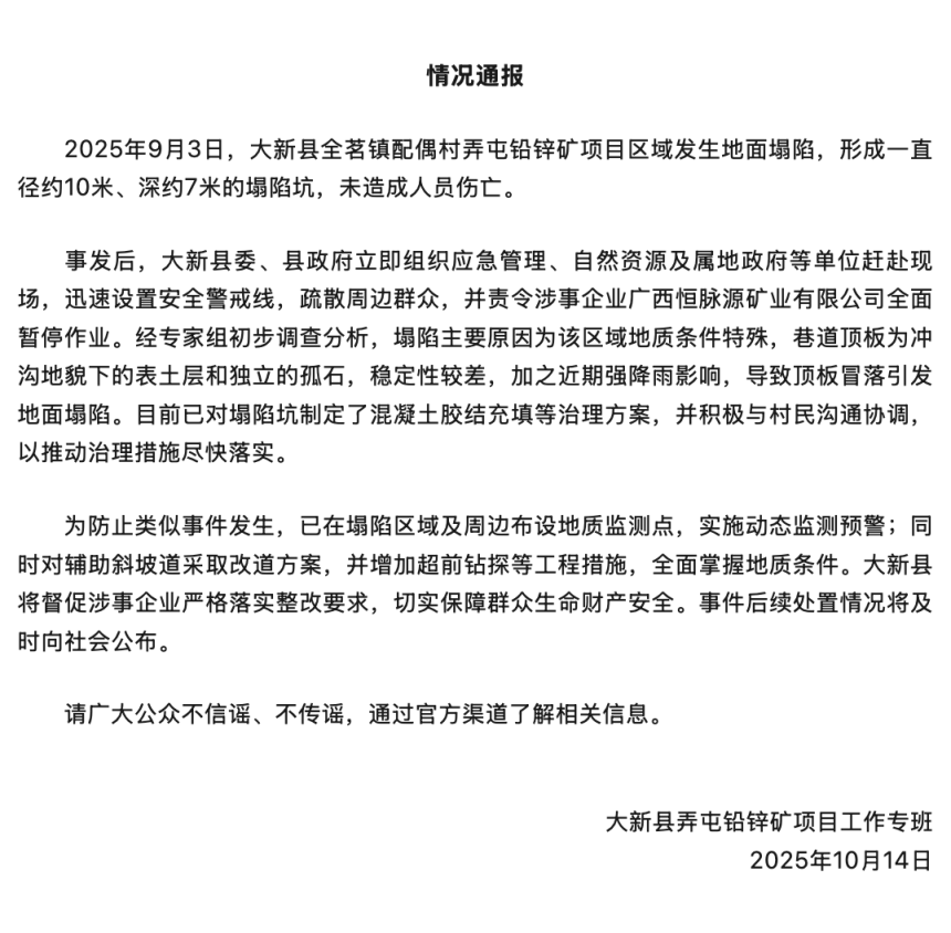 据“今日大新”微信公众号10月15日消息,广西崇左市大新县弄屯铅锌矿项目工作专班14日发布“情况通报”称,该县一铅锌矿发生塌陷金勺子,涉事企业被全面暂停作业。以下为详情——