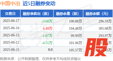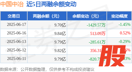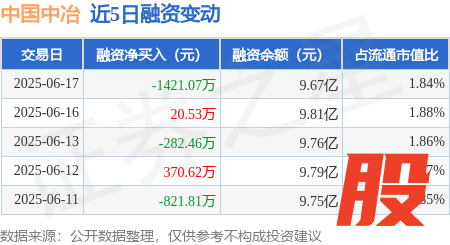本站消息,6月17日,中国中冶(601618)融资买入3900.78万元,融资偿还5321.85万元,融资净卖出1421.07万元东方财通,融资余额9.67亿元。