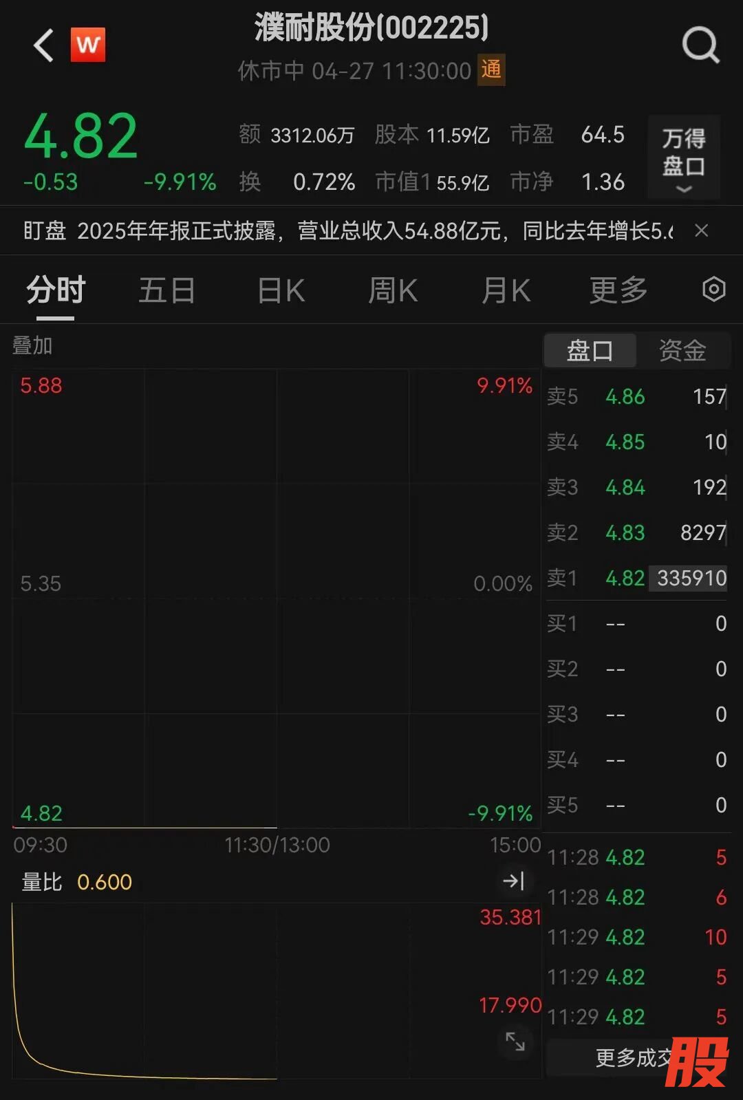 今日,濮耐股份开盘一字跌停,股价报4.82元,封单超11万手。